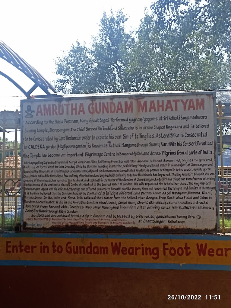 Sri Ketaki Sangameswara Swamy temple is located in Jharasangam, Sangareddy District, Zahirabad. The presiding deity of the temple is Lord Shiva with Goddess Parvathi Devi. Devotees from Telangana, Karnataka, and Maharashtra visit the temple in large numbers every Amavasya night and on other festive days like Shivarathri, Karthika Masam and Shravana Masam days.